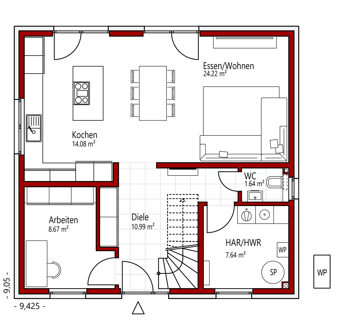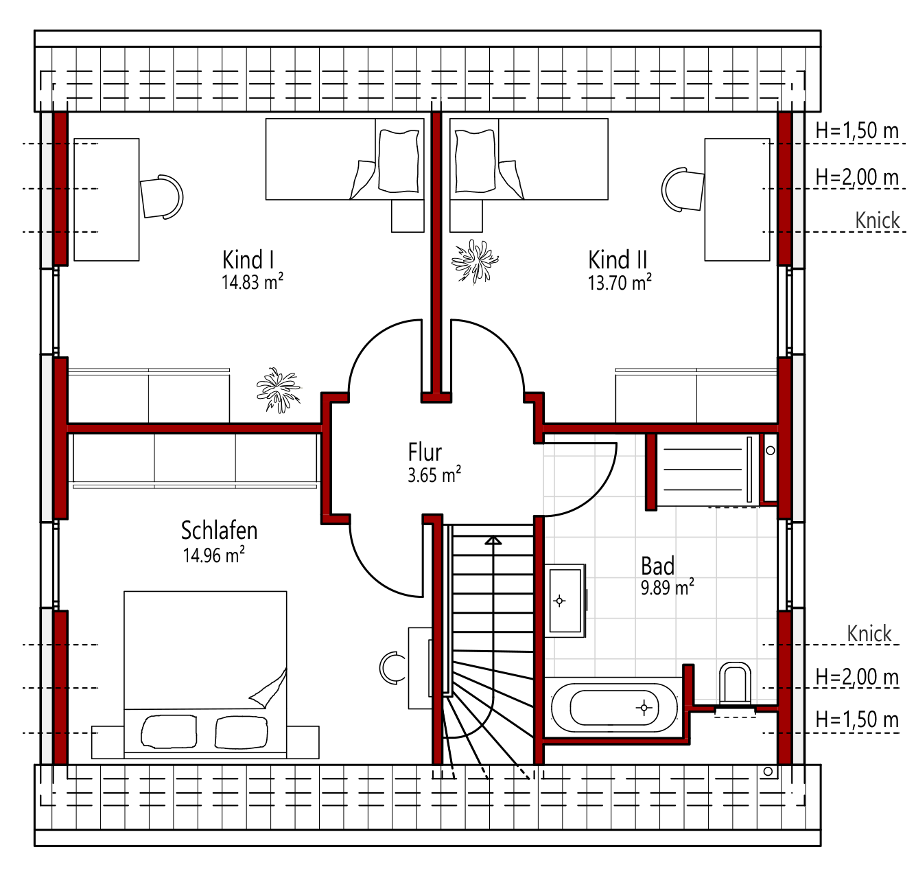 Der zum Garten ausgerichtete und offene Wohn-, Ess- und Kochbereich bildet den Mittelpunkt des G 20. Das kompakte Einfamilienhaus ist des Weiteren mit einem Arbeits- oder Gästezimmer, sowie einem Gäste-WC und einem HWR im Erdgeschoss vollwertig ausgeschattet. Über die viertelgewendelte Treppe erreicht man das Obergeschoss mit zwei geräumigen Kinderzimmern und einem Elternschlafzimmer mit Schranknische. Das Bad mit Dusche, Wanne, Waschtisch und Toilette runden das Obergeschoss ab.