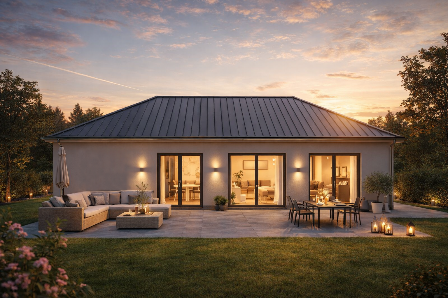 Dieser ebenerdige Bungalow überzeugt durch eine klare Zonierung in privaten Rückzugsbereich und offenen Wohn-/Essbereich. Der zentrale, großzügige Wohnraum mit Essplatz und angrenzender Küche bildet das Herz des Hauses und bietet durch die Terrassentür einen direkten Bezug nach draußen. Der Schlafbereich ist separat angeordnet und verfügt über ein komfortables Schlafzimmer mit Ankleide sowie einem großzügigen Bad. Ergänzt wird das Raumangebot durch ein Gäste-/Arbeitszimmer und ein zusätzliches Gäste-Duschbad – ideal für Besuch oder Homeoffice. Die Diele mit Garderobe schafft einen aufgeräumten Eingangsbereich.