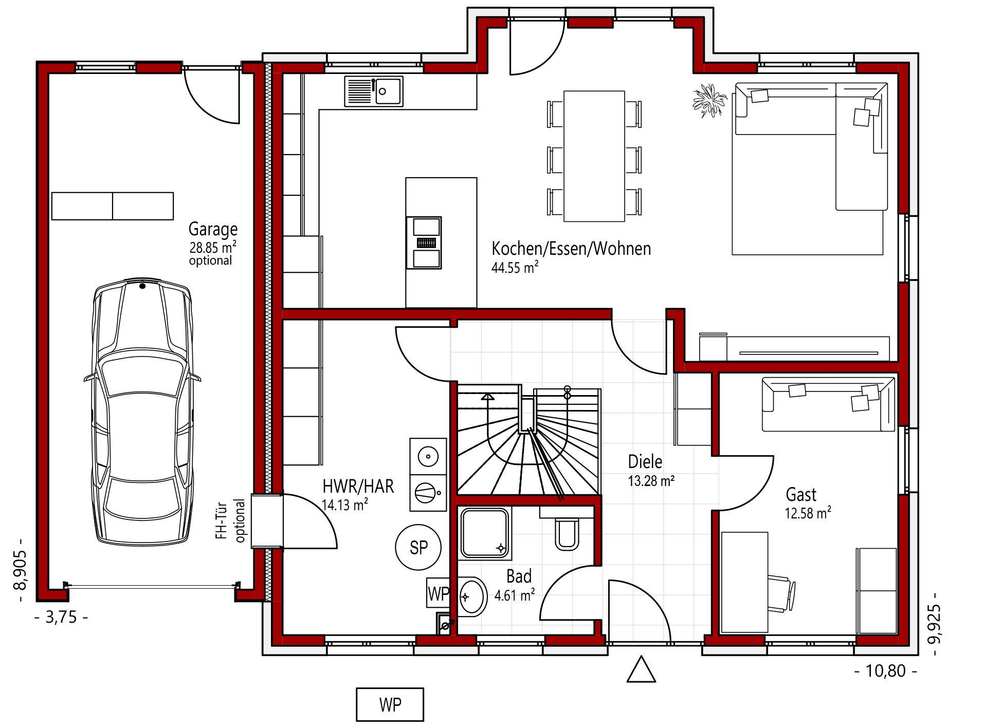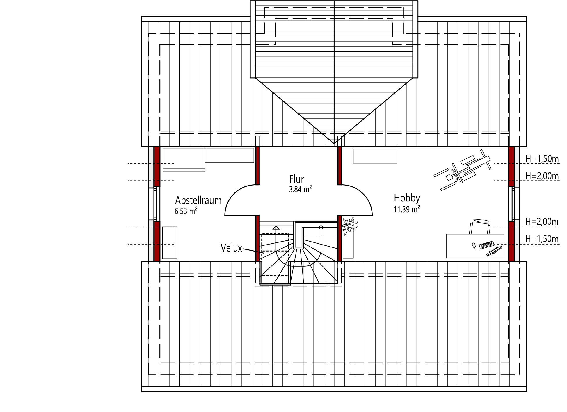Diesen Haustyp zeichnet die Möglichkeit aus, das Dachgeschoss mit zwei bis drei Räumen zusätzlich ausbauen zu können. Das Erdgeschoss bietet neben einem großzügigen Gästezimmer einen offenen und lichtdurchfluteten Wohn-, Ess- und Kochbereich, welcher optional mit einer Schiebetür voneinander abgegrenzt werden kann. Ein Gästebad sowie ein funktional gestalteter Hauswirtschaftsraum, mit der Option, diesen mit einer Garage zu verbinden, runden das Erdgeschoss ab. Über eine halbgewendelte Treppe erreicht man das Obergeschoss, in welchem sich neben einem Schlafzimmer mit Abstellraum auch zwei geräumige Kinderzimmer befinden. Das Badezimmer bietet Platz für eine große Dusche, Badewanne, Toilette, Doppelwaschtisch und Stauraum. Die Treppe führt vom Obergeschoss weiter in das Dachgeschoss, welches den Wohnkomfort mit einem Hobbyraum und bis zu zwei Abstellräumen erweitern kann. Optisch setzt der Zwerchgiebel zum Garten das Highlight der Fassadengestaltung. Symmetrisch angeordnete Fenster sorgen für einen klaren Stil.