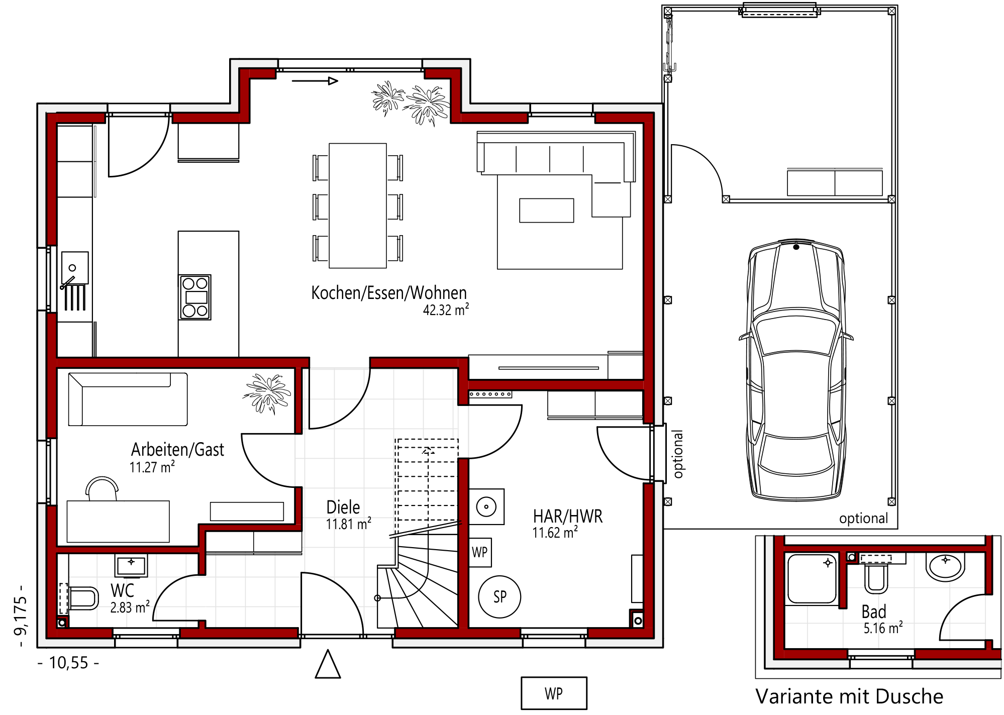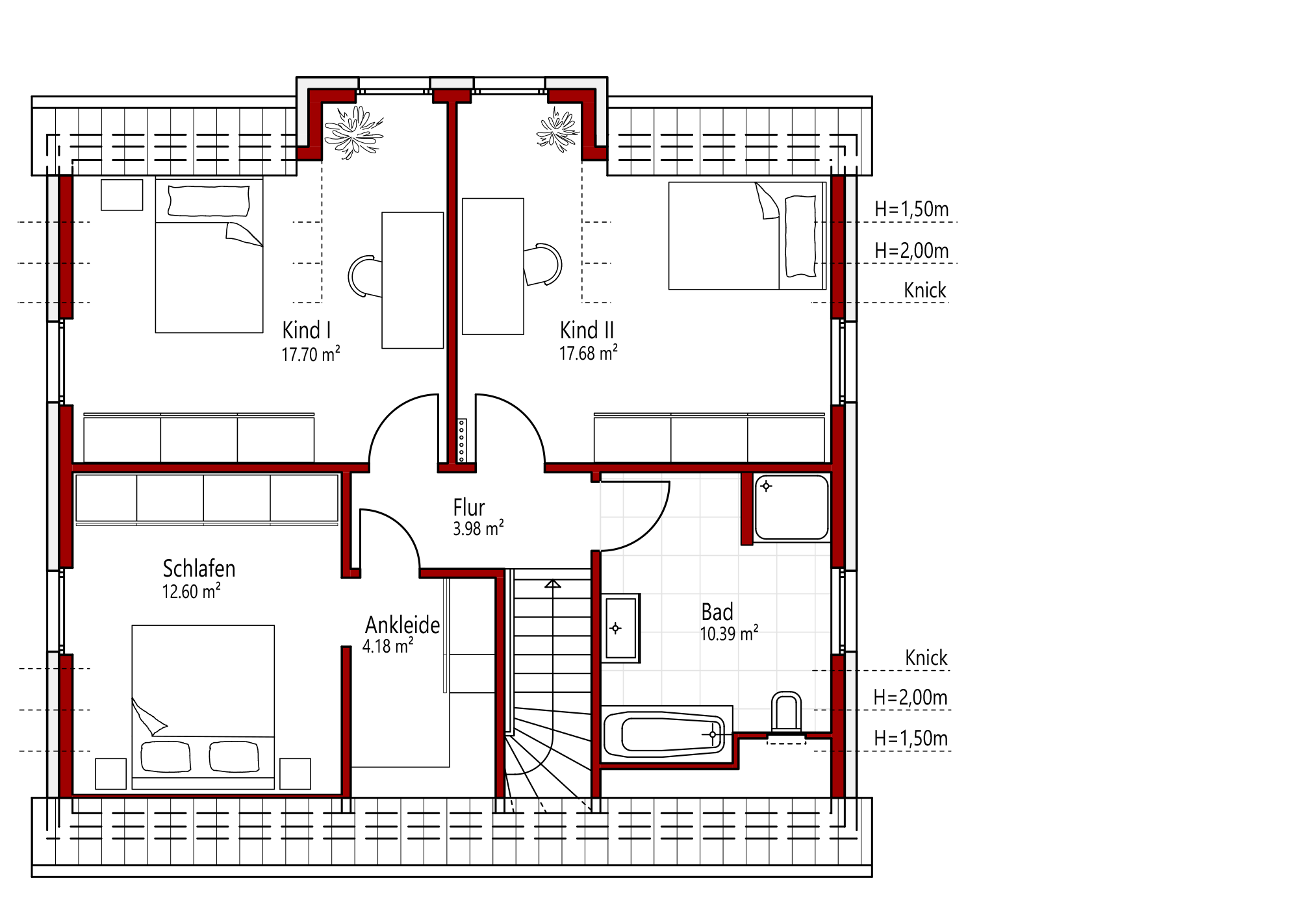 Dieses klassische Satteldachhaus erhält durch den Zwerchgiebel eine ansprechende optische Auflockerung der Putzfassade. Der Zwerchgiebel kann entweder als Satteldach oder Flachdach ausgeführt werden und bringt besonders in den Kinderzimmern zusätzlichen Komfort.