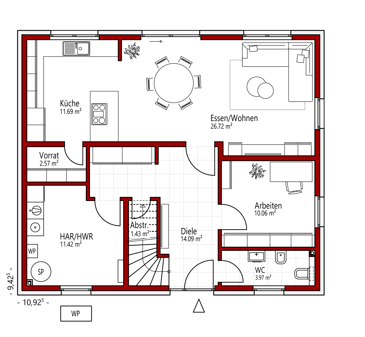 Dieser Einfamilienhaustyp verbindet kompakte Bauweise mit einem großzügigen, gut durchdachten Raumkonzept. Der offen gestaltete Wohn- und Essbereich bildet das Herzstück des Hauses und schafft eine helle, einladende Wohnatmosphäre. Die separate Küche mit angrenzenden Funktionsräumen sorgt für Struktur und kurze Wege im Alltag. Ein flexibel nutzbares Arbeitszimmer im Erdgeschoss ergänzt das Raumangebot sinnvoll.