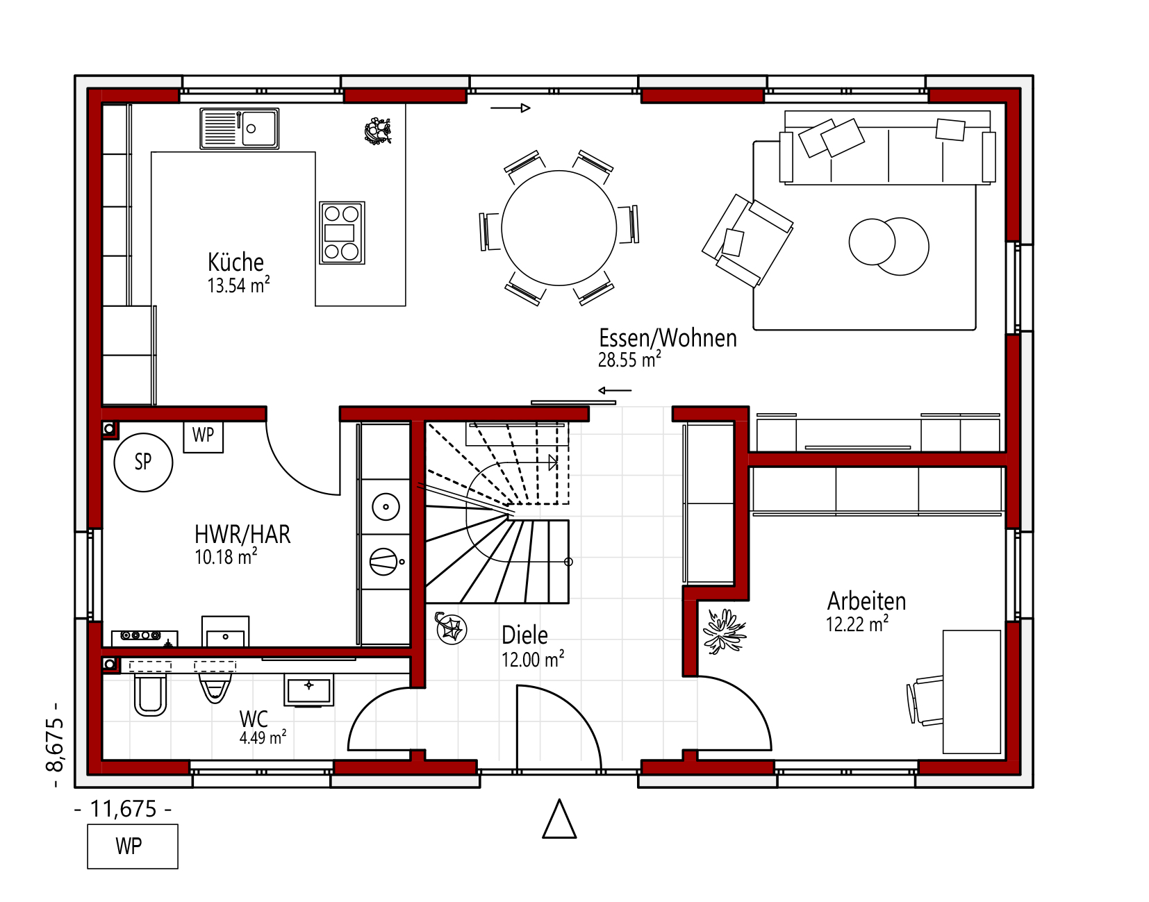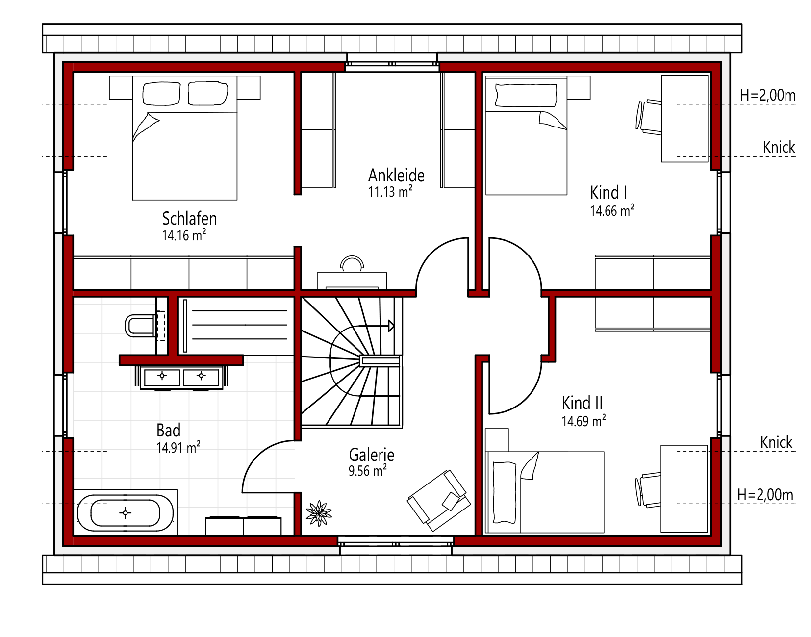 Dieses Einfamilienhaus zeichnet sich durch einen kompakten aber geräumigen Grundriss aus. Das Erdgeschoss bietet, je nach Bedürfnis, die Möglichkeit ein Arbeitszimmer zu integrieren bzw. diesen Raum für eine große offene Küche zu nutzen. Ein Ess- und Wohnzimmer sowie ein Hauswirtschaftsraum mit vielen Stellflächen und ein Gäste-WC runden die untere Etage ab. Durch einen hohen Drempel im Obergeschoss entstehen drei ähnlich große Schlafräume und ein geräumiges Bad. Lichtbänder sowie die Kombination von Putz und Klinker kompletieren den modernen Charakter des Hauses.