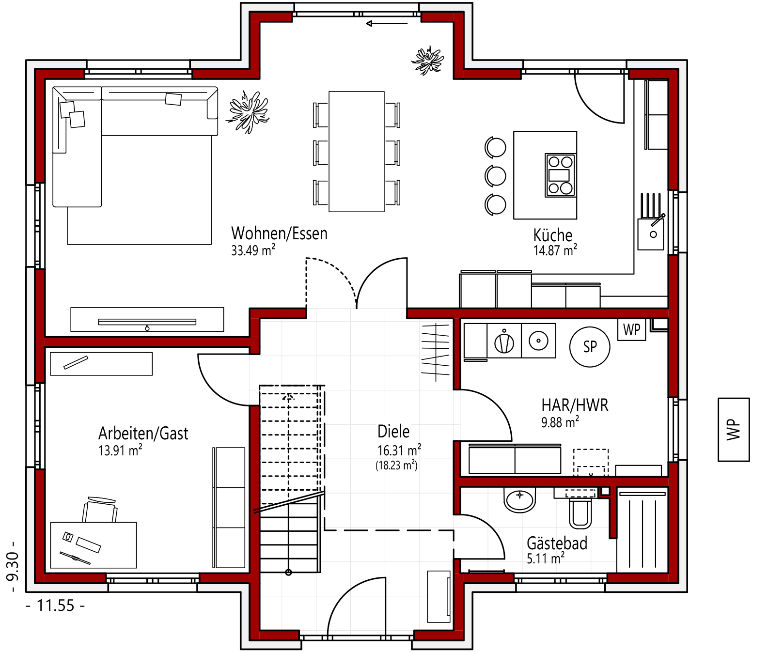 Dieser moderner Einfamilienhaustyp verbindet großzügiges Wohnen mit einer klar strukturierten Raumaufteilung. Der offene Wohn-, Ess- und Kochbereich im Erdgeschoss bildet das kommunikative Zentrum des Hauses und bietet viel Raum für gemeinsames Leben. Ergänzt wird die Ebene durch ein flexibel nutzbares Arbeits- oder Gästezimmer sowie funktionale Nebenräume.