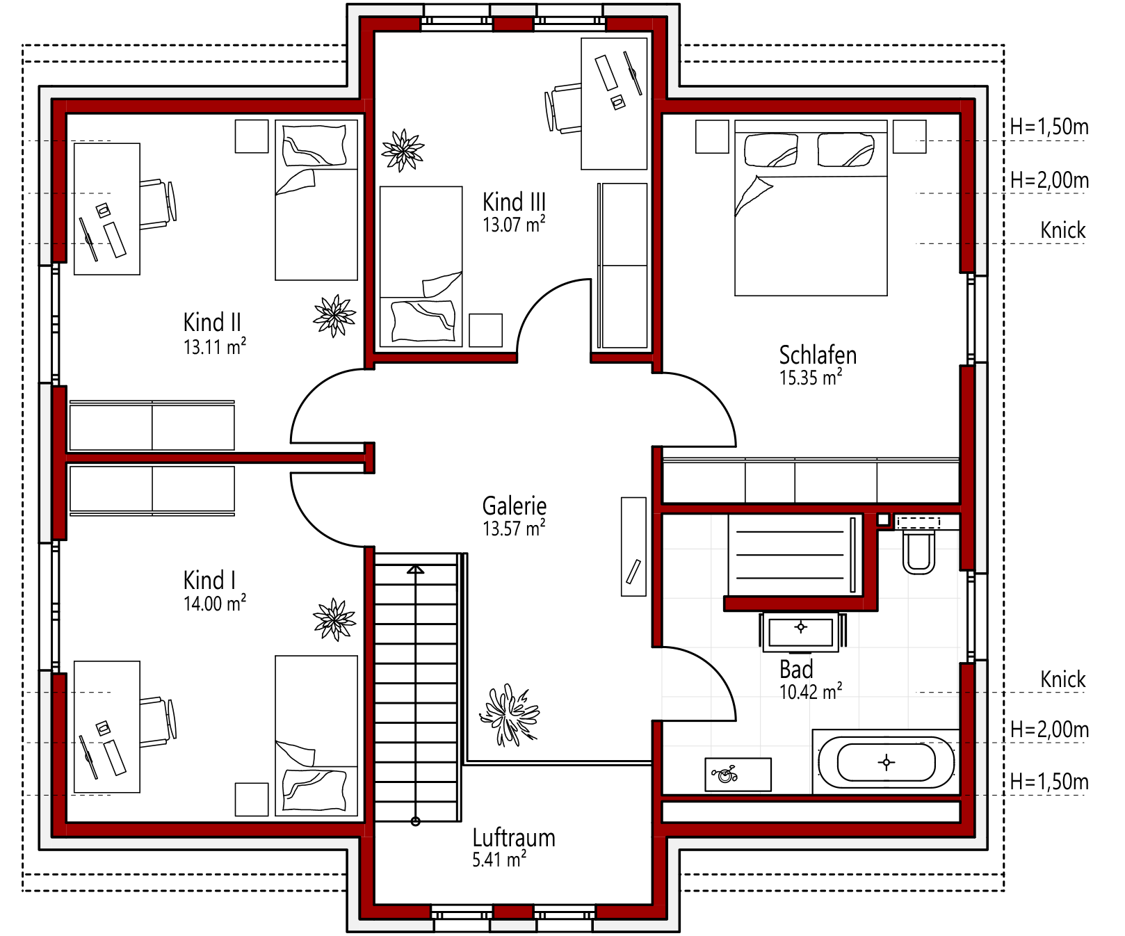 Im Obergeschoss schafft eine offene Galerie mit Luftraum eine helle, luftige Atmosphäre und verbindet die privaten Rückzugsräume. Mehrere Kinderzimmer, ein großzügiges Schlafzimmer und ein komfortables Bad bieten ideale Voraussetzungen für das Familienleben