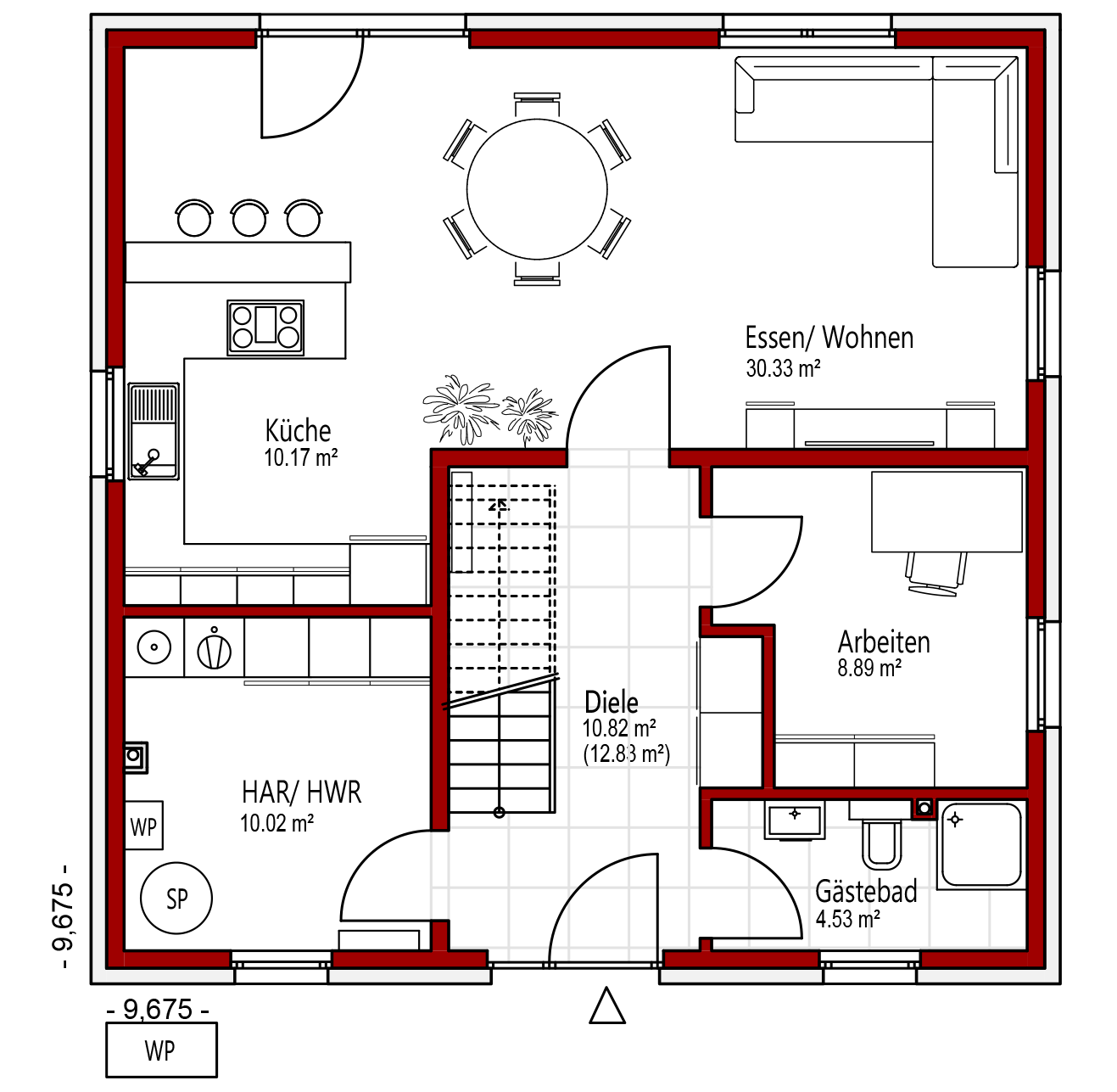 Diese moderne Stadtvilla mit einem 25° Zeltdach bietet auf zwei Vollgeschossen großzügige 147 m² Wohnfläche. Bereits im Erdgeschoss beeindruckt der Eingangsbereich mit einer praktischen Garderobennische und einer Haustür mit Seitenteil. Der offen gestaltete Wohn- und Essbereich sowie die angrenzende Küche sind durch bodentiefe Fenster lichtdurchflutet und wirken besonders einladend. Ein zusätzliches Zimmer, das als Arbeits- oder Gästezimmer genutzt werden kann, erweitert den Wohnkomfort. Abgerundet wird das Erdgeschoss durch einen geräumigen Hauswirtschaftsraum mit viel Stauraum und ein Gästebad mit Dusche.