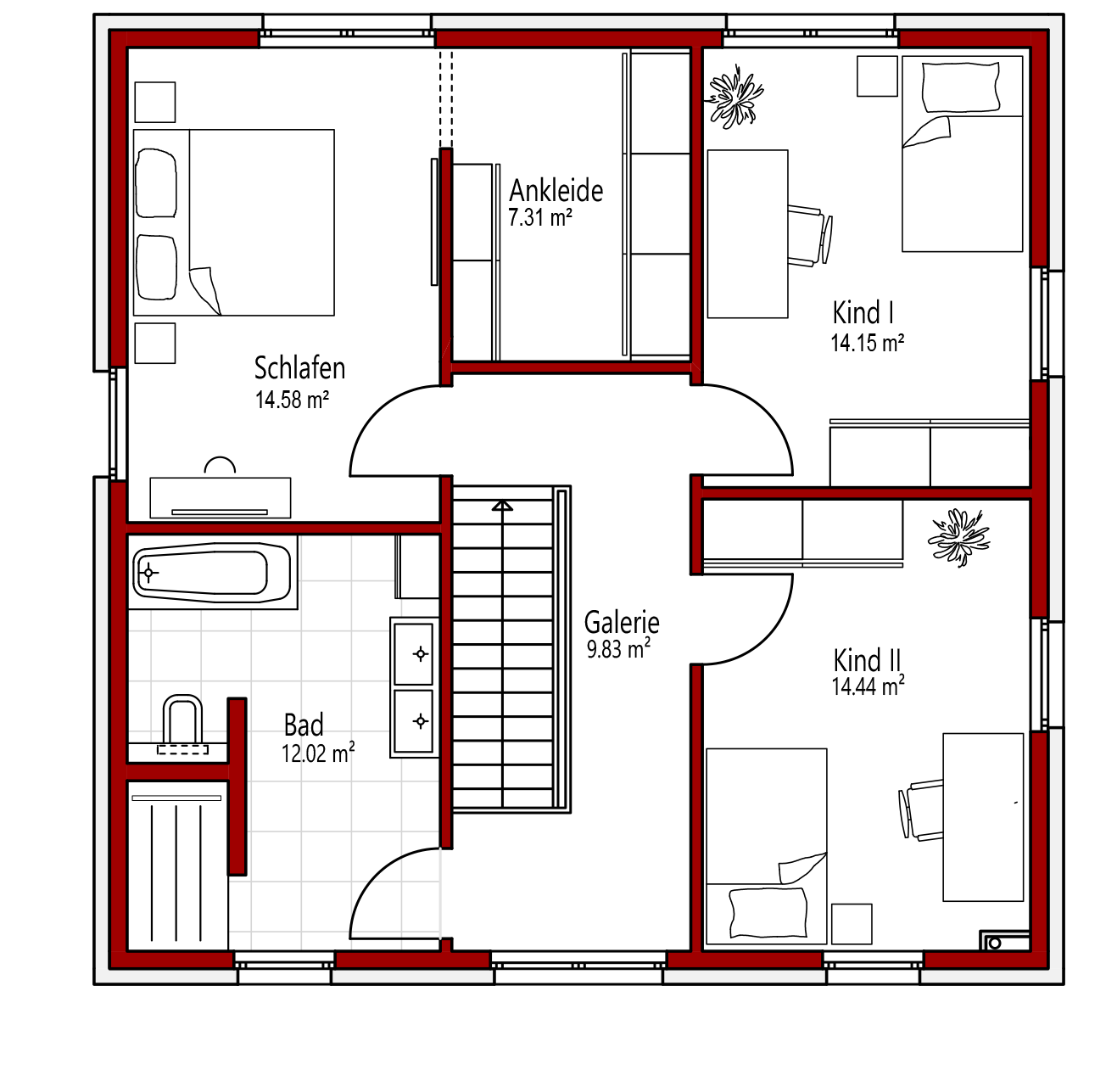 Eine gerade Treppe in der großzügigen Diele führt in das Obergeschoss, wo ein geräumiges Schlafzimmer mit separatem Ankleidezimmer wartet. Die helle Galerie mit einem doppelflügeligen Fenster setzt moderne Akzente. Zwei komfortable Kinderzimmer und ein großes Badezimmer mit Badewanne und Duschnische vervollständigen das Wohnangebot.